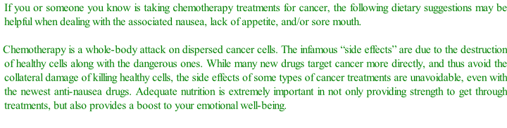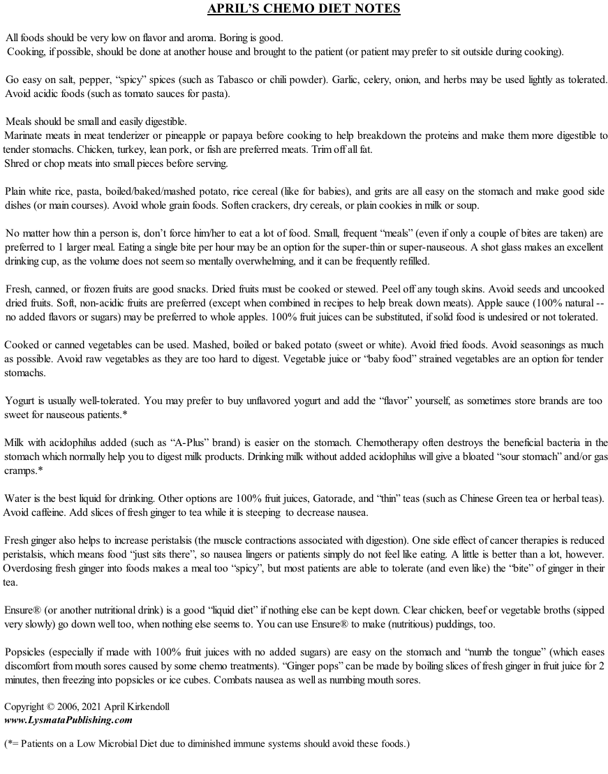 These diet suggestions are condensed from years of discussions with various chemo patients and nurses for dealing with the nausea and lack of appetite due to treatments. Feel free to print out these suggestions to stick on your refrigerator.